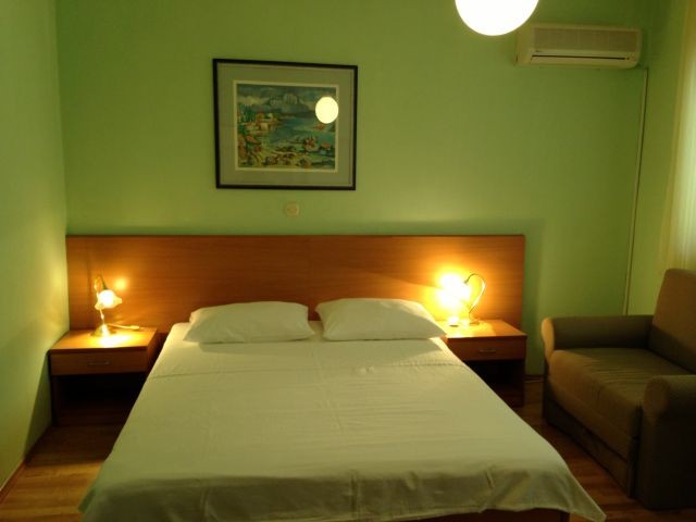 Sobe : bračni krevet, ležaj na razvlačenje ( soba nije odvojena prostorija ),  posteljina