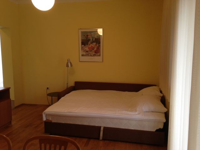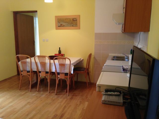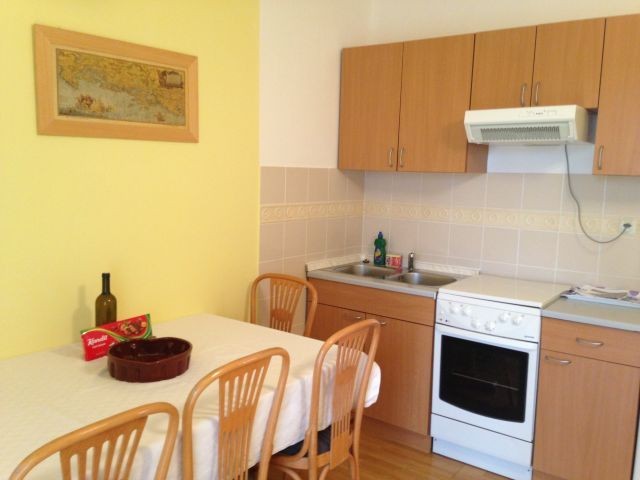 Kuhinja : štednjak/plin + struja, pećnica, hladnjak, kuhinjsko posuđe i pribor, kuhalo za vodu, aparat za kavu, ležaj na razvlačenje