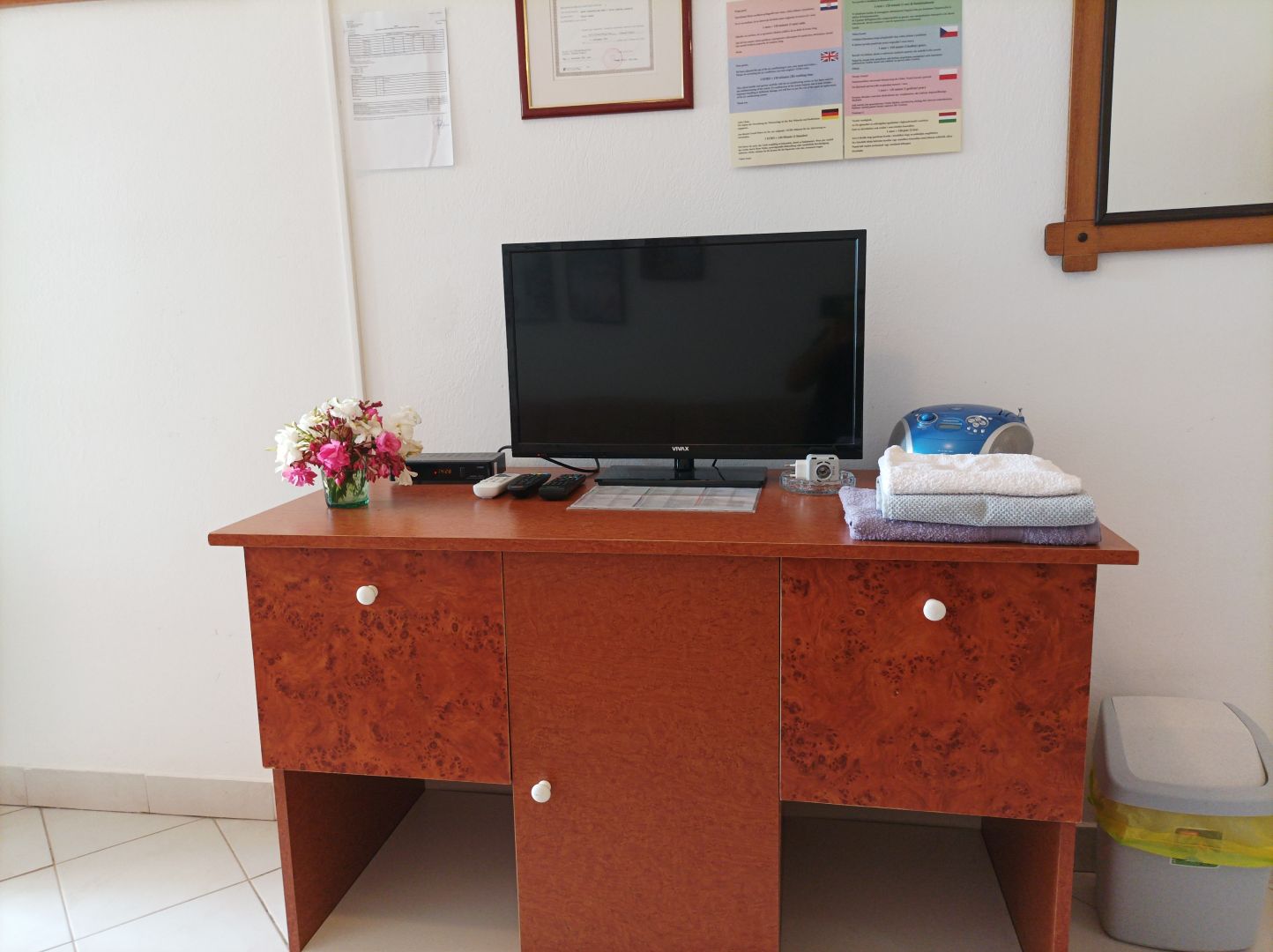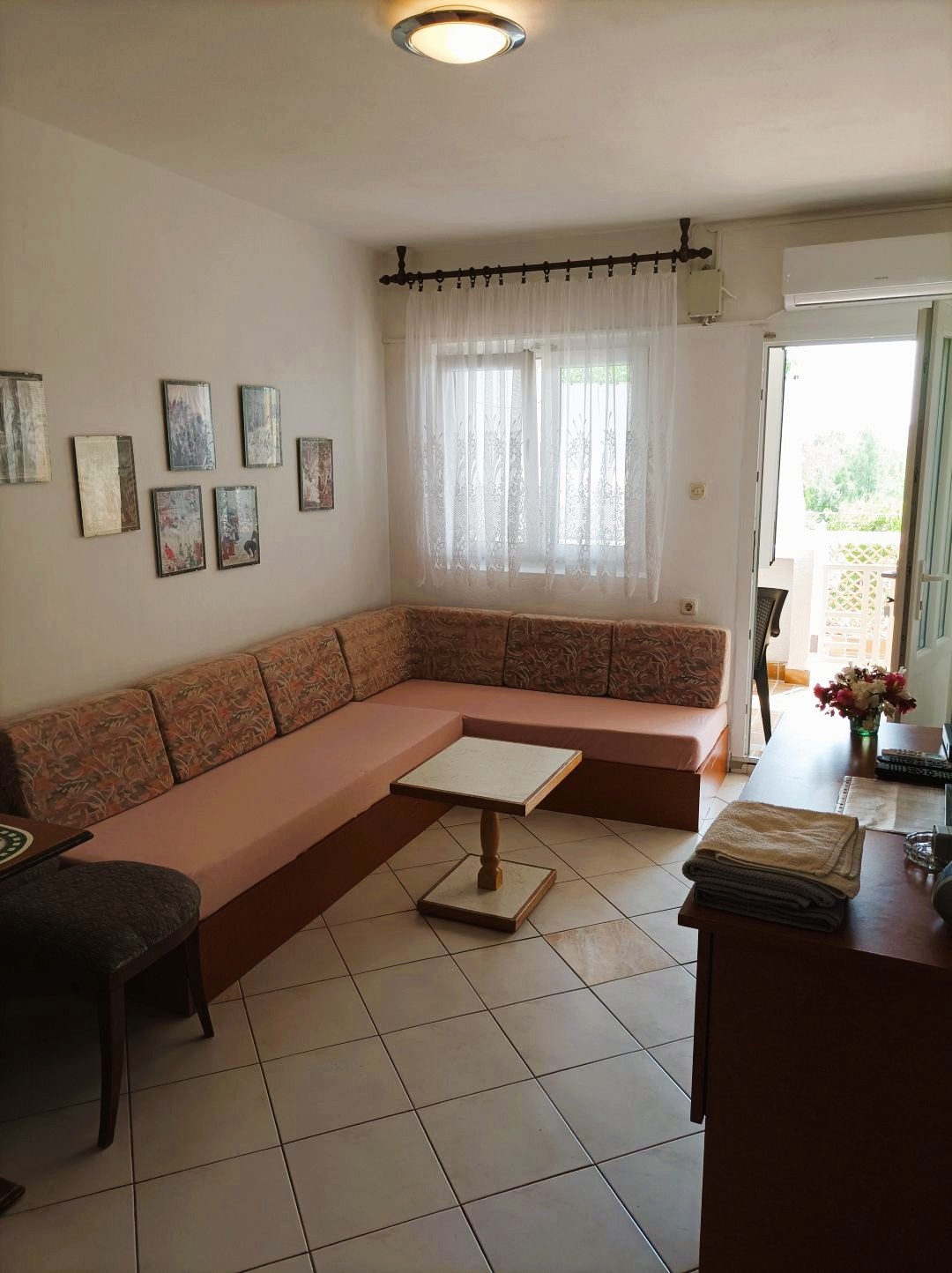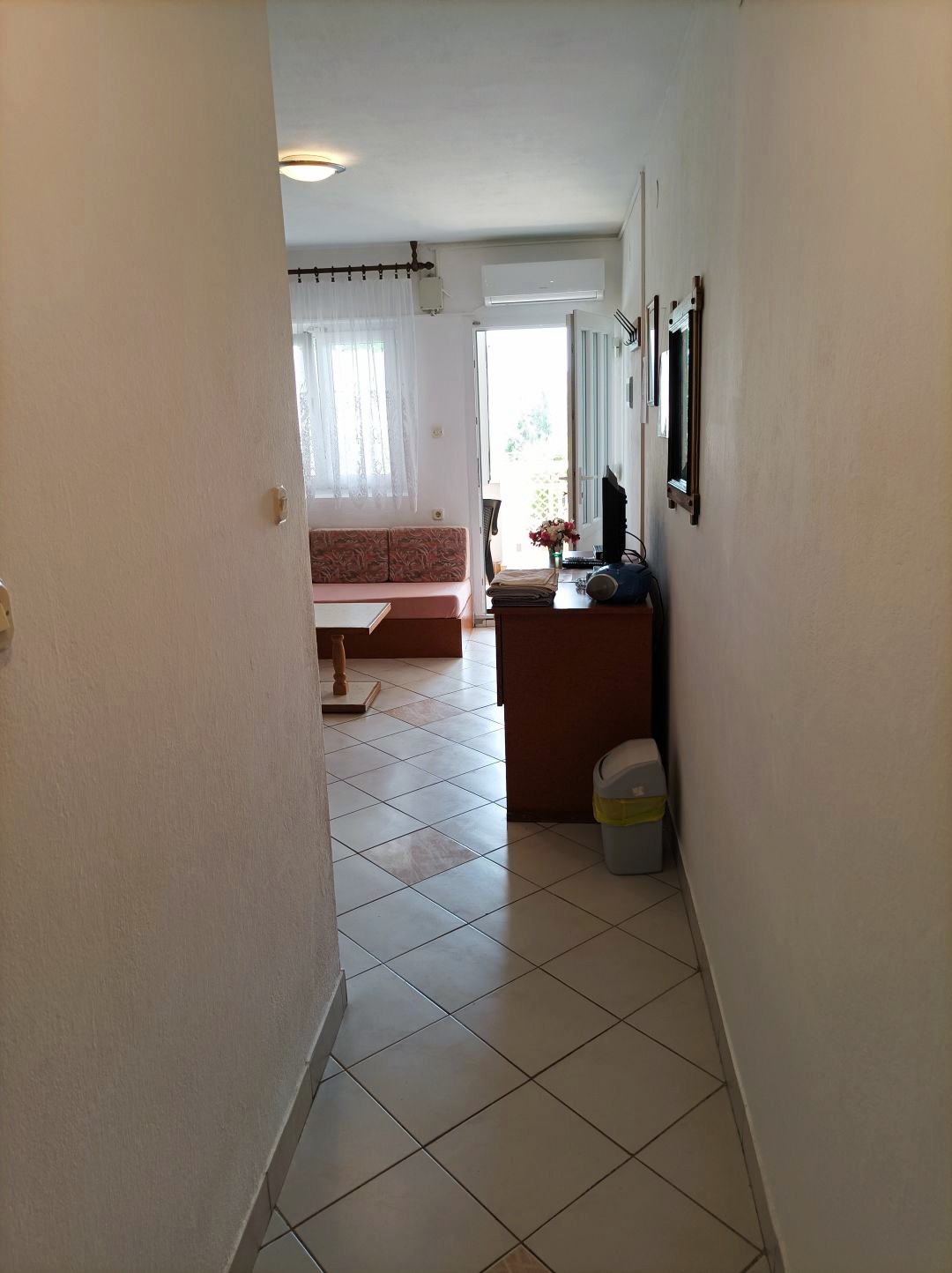 Kuhinja, opremljena štednjakom s pećnicom i hladnjakom sa zamrzivačem i blagovaonica/dnevni boravak nalaze se u istoj prostoriji. Tu su kauč i TV ravnog ekrana sa satelitskim prijemom. Spavaća soba ima bračni krevet. Kupaonica sadrži tuš-kadu, WC i umivaonik. Posteljina i ručnici su uključeni u cijenu najma. Klima uređaj se naplaćuje po cijeni od 1,00 € za 2 sata korištenja. Gosti mogu besplatno koristiti WiFi i perilicu kojom se mogu koristiti gosti koji borave u preostala dva apartmana u objektu.